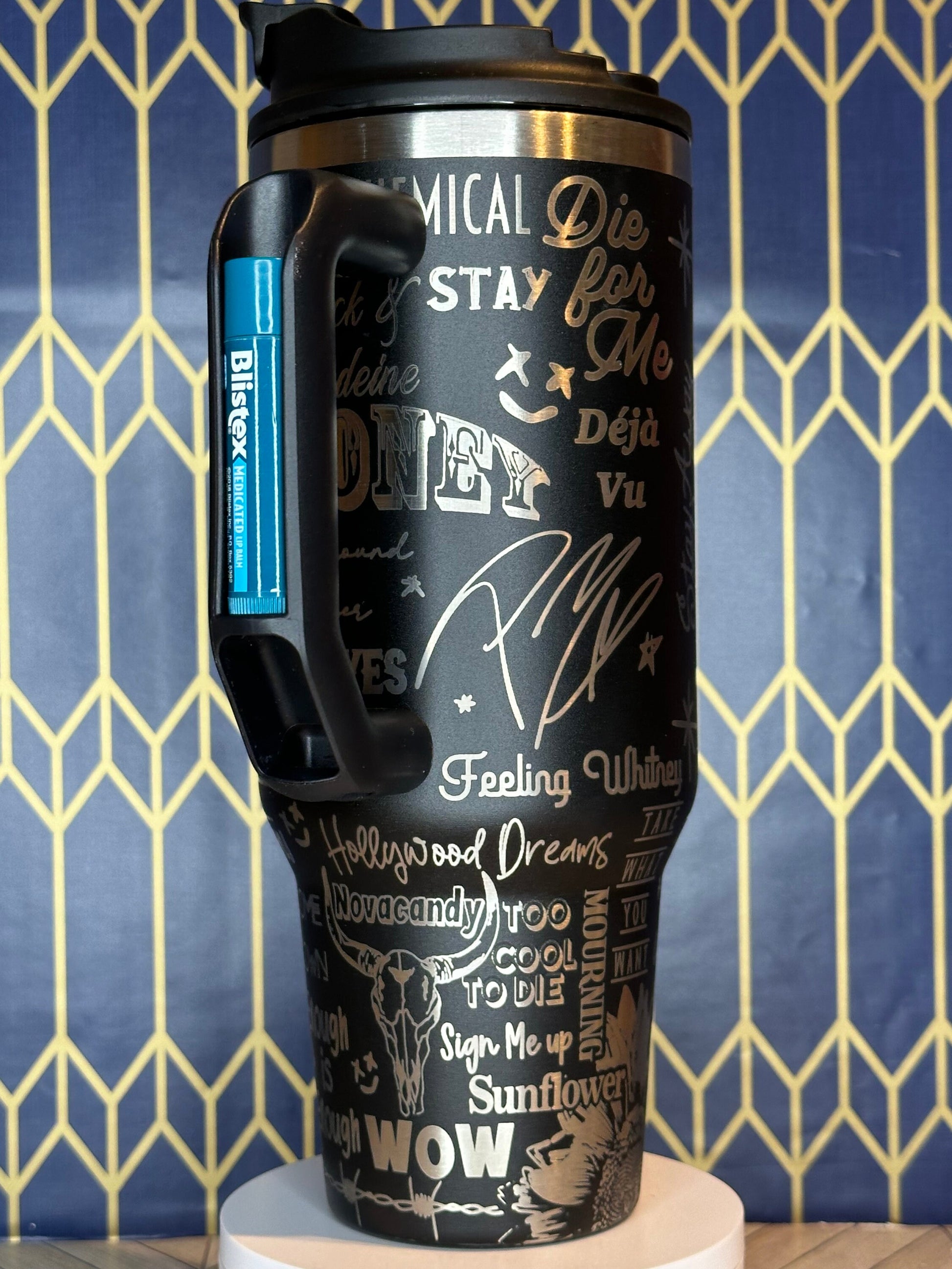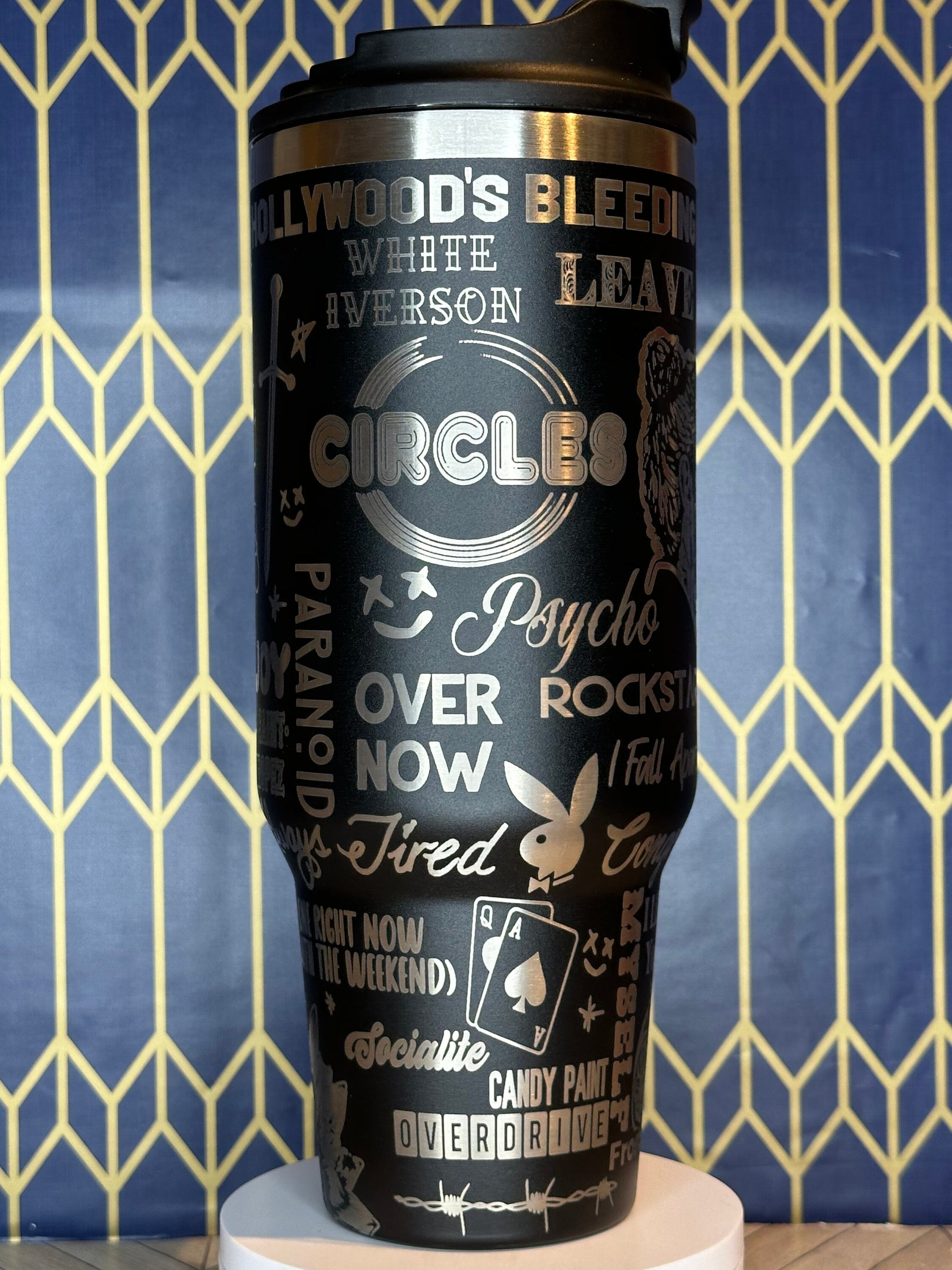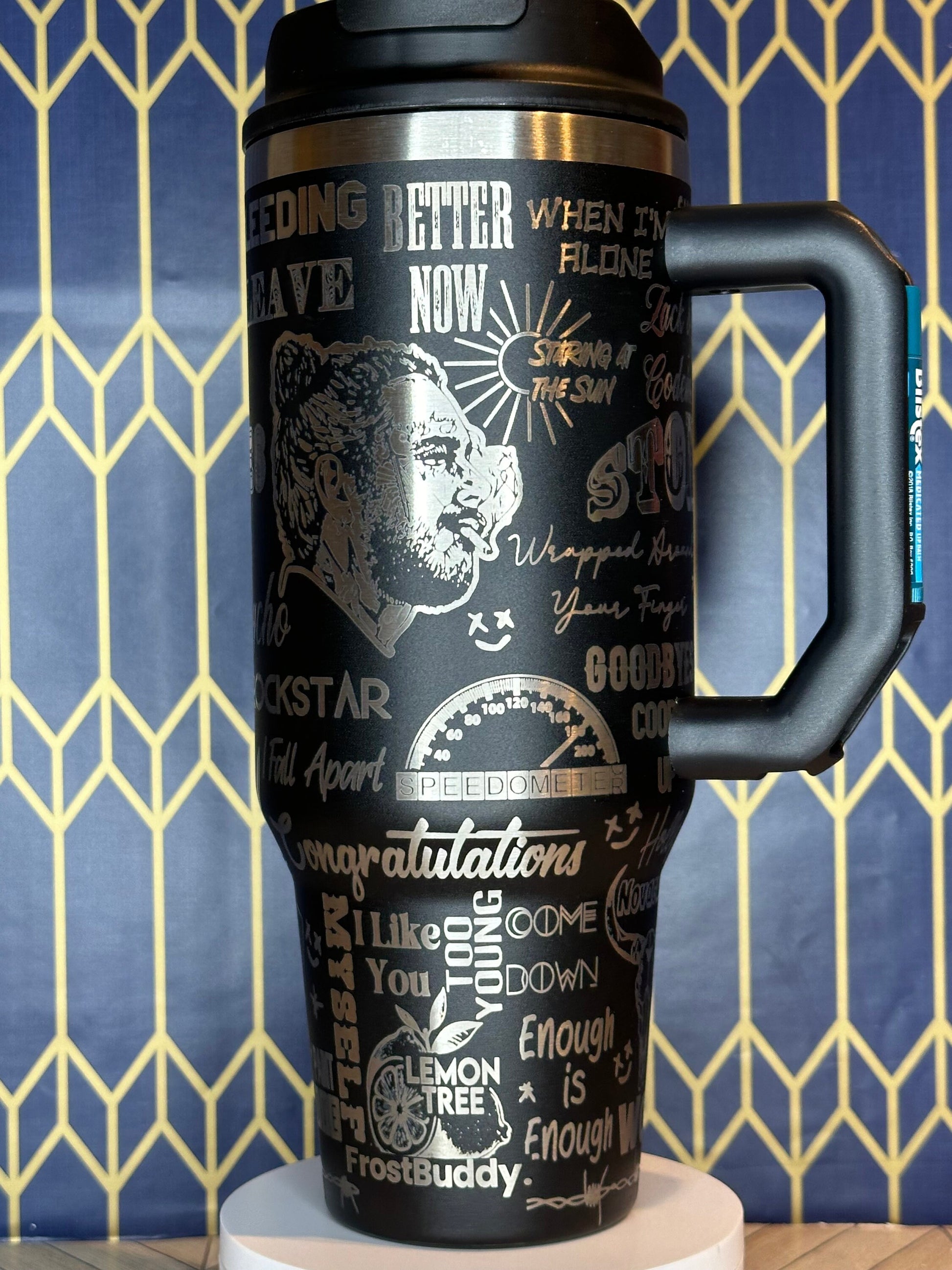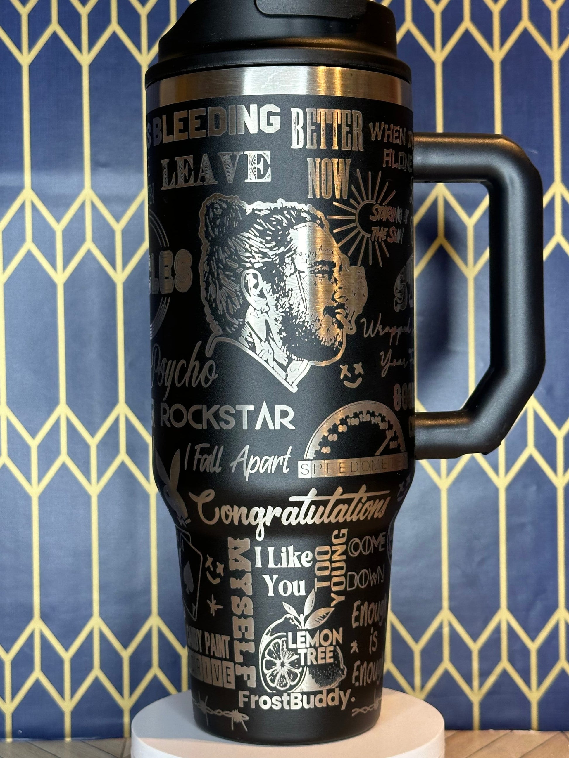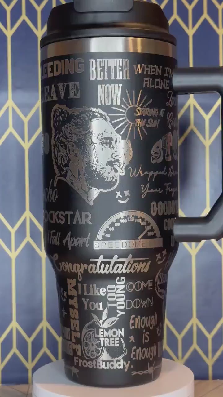 Demuestra tu pasión por Post Malone con este vaso de acero inoxidable de diseño exclusivo, perfecto para el día a día. Con intrincados grabados de los distintivos tatuajes faciales de Post Malone y letras de canciones, este vaso no es solo una bebida, sino una obra de arte.