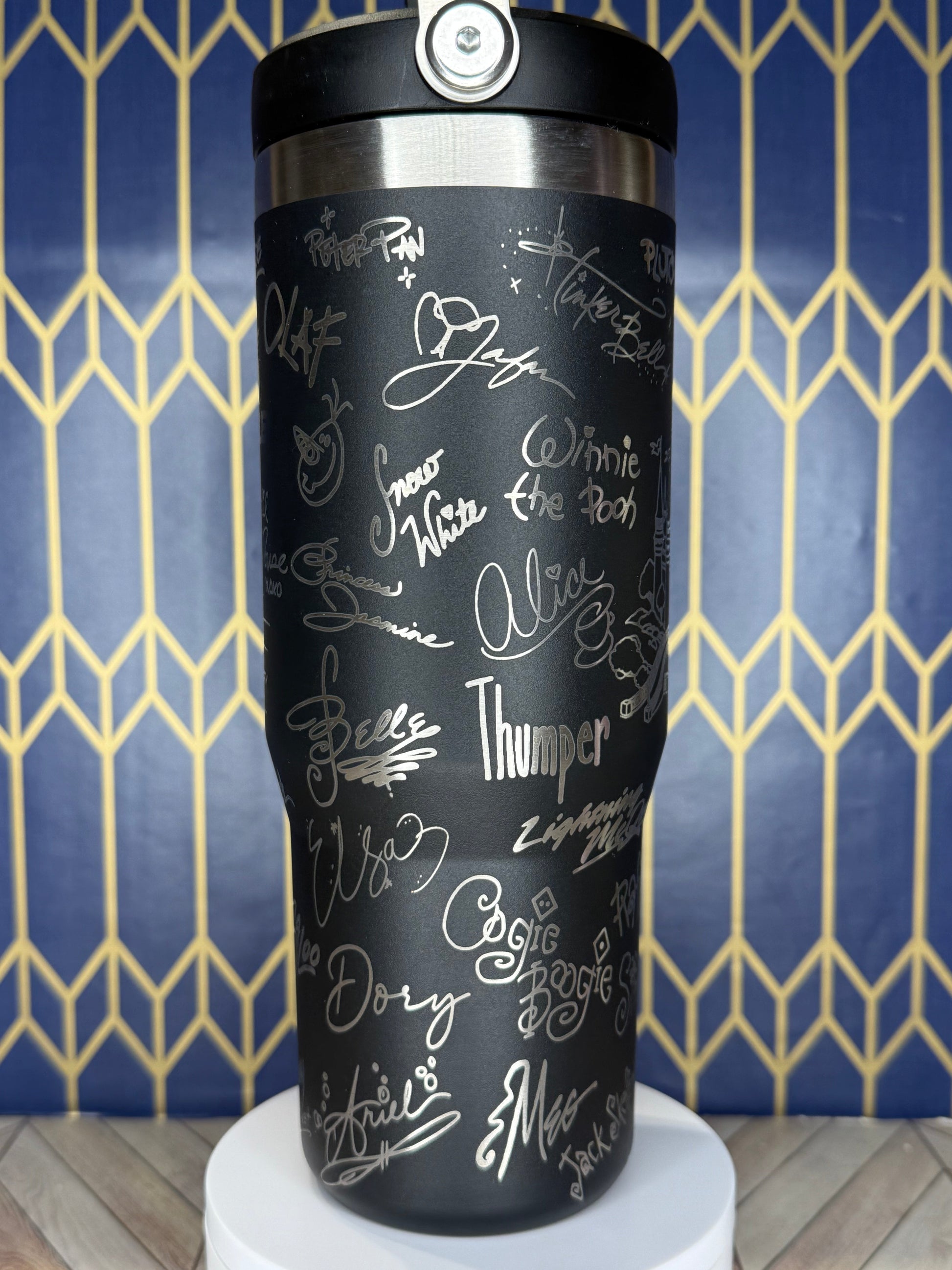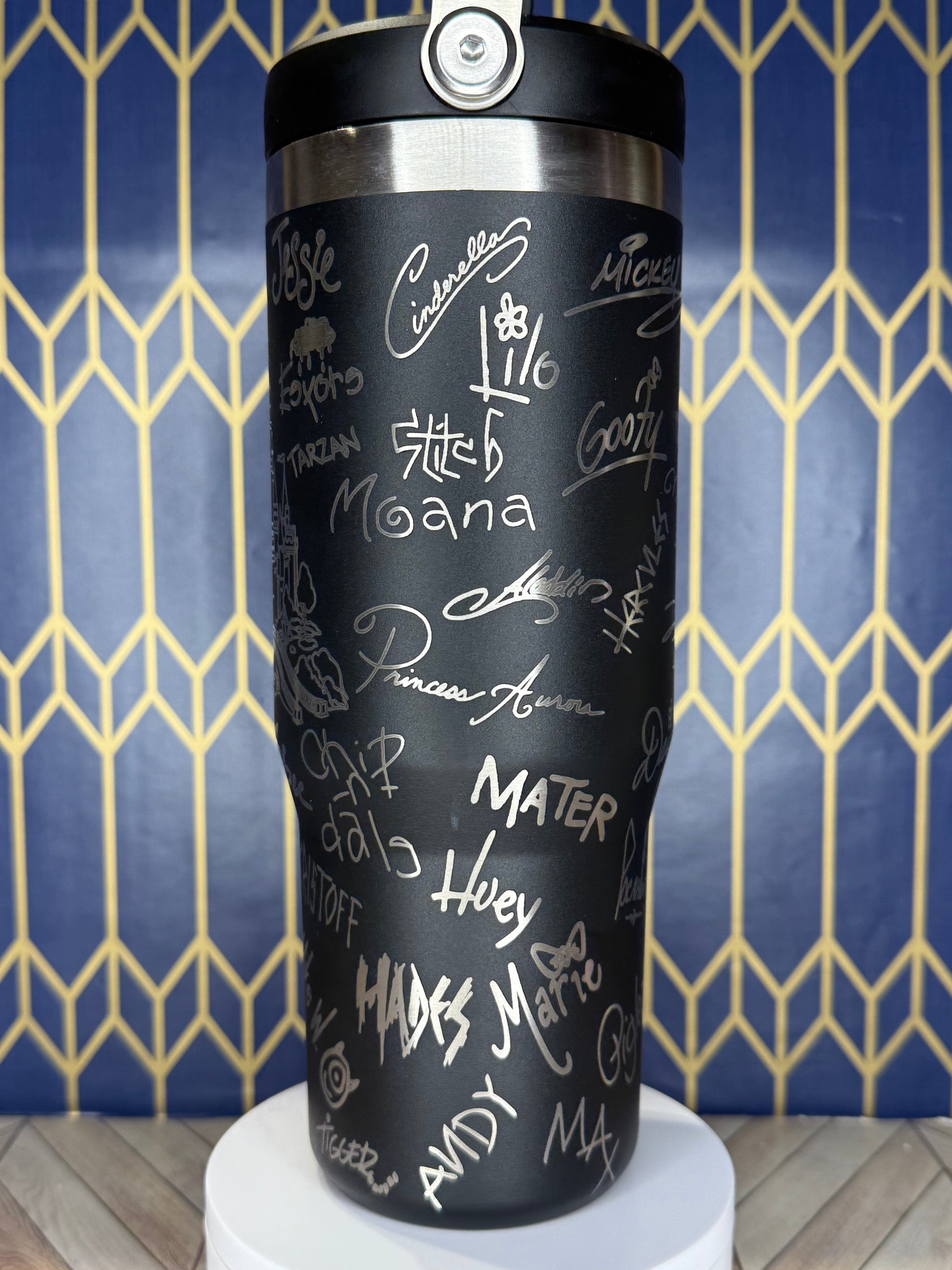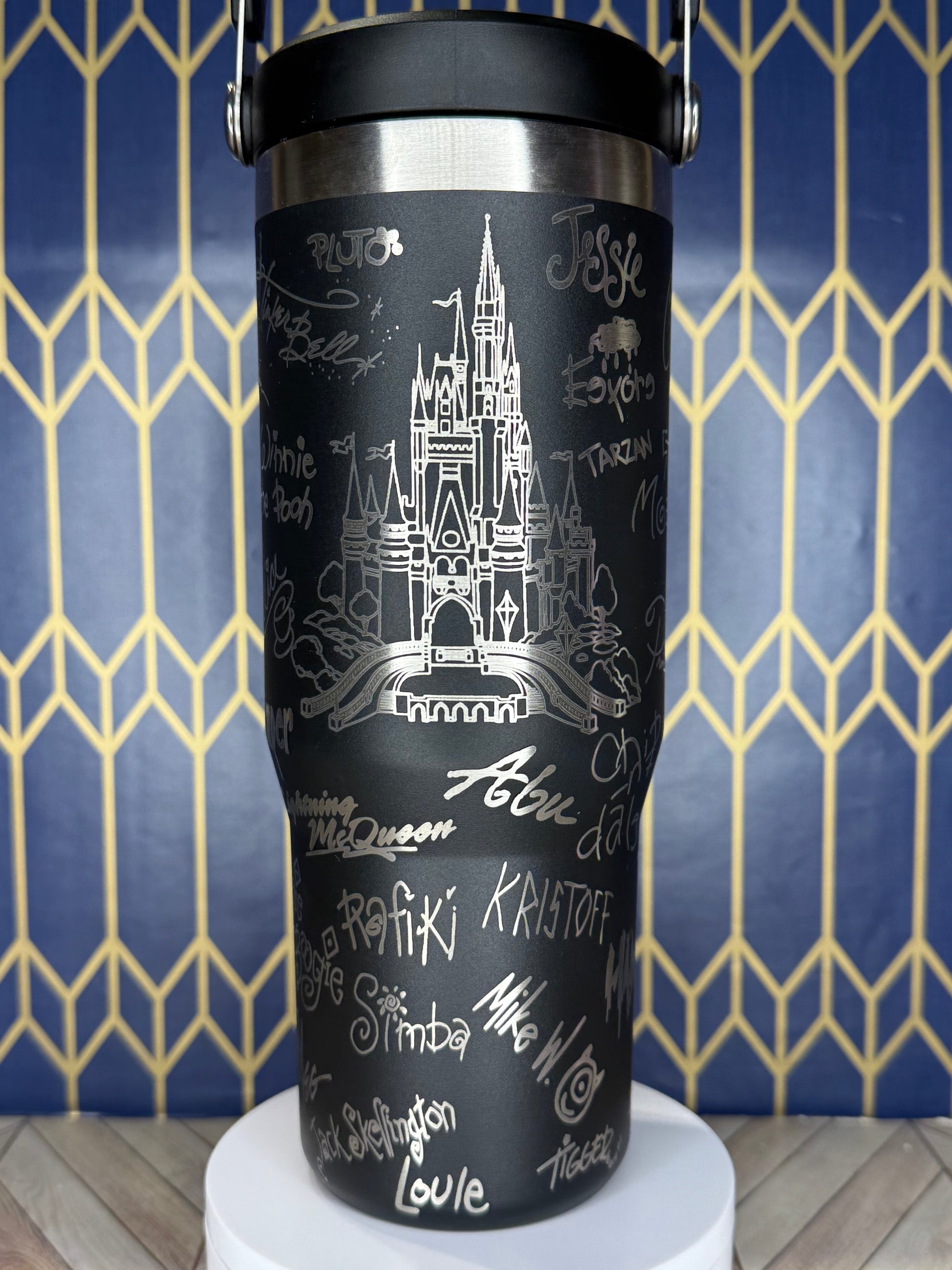 🏰 Bring the magic of Disney to your daily routine! This stunning tumbler features the iconic Disney castle surrounded by the signatures of beloved Disney characters. Perfect for fans who want a little pixie dust in every sip! ✨