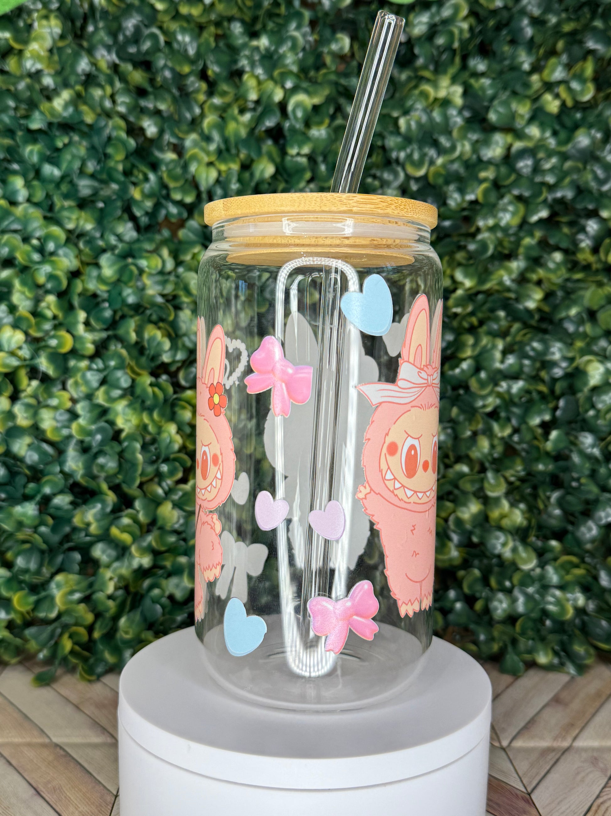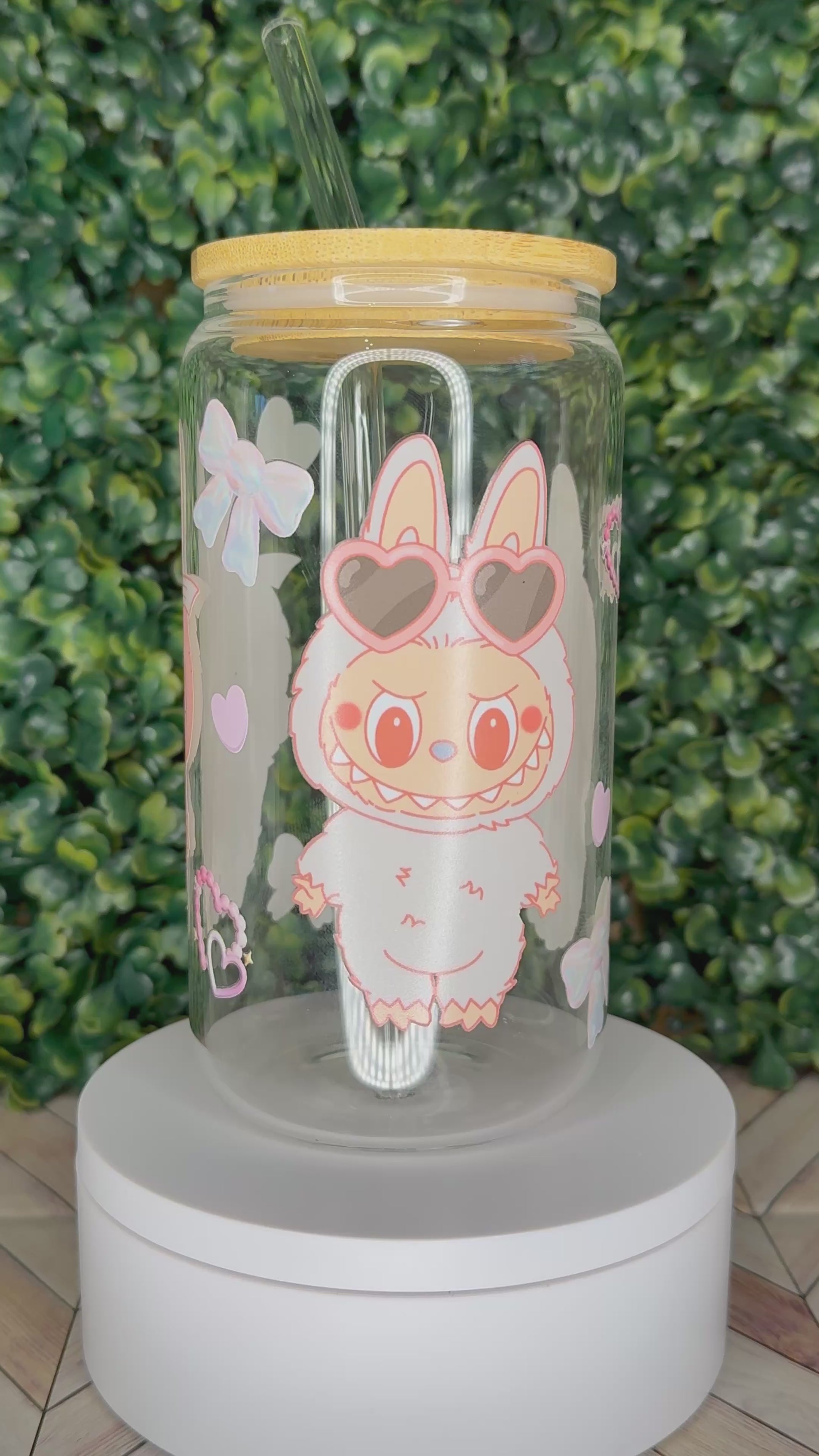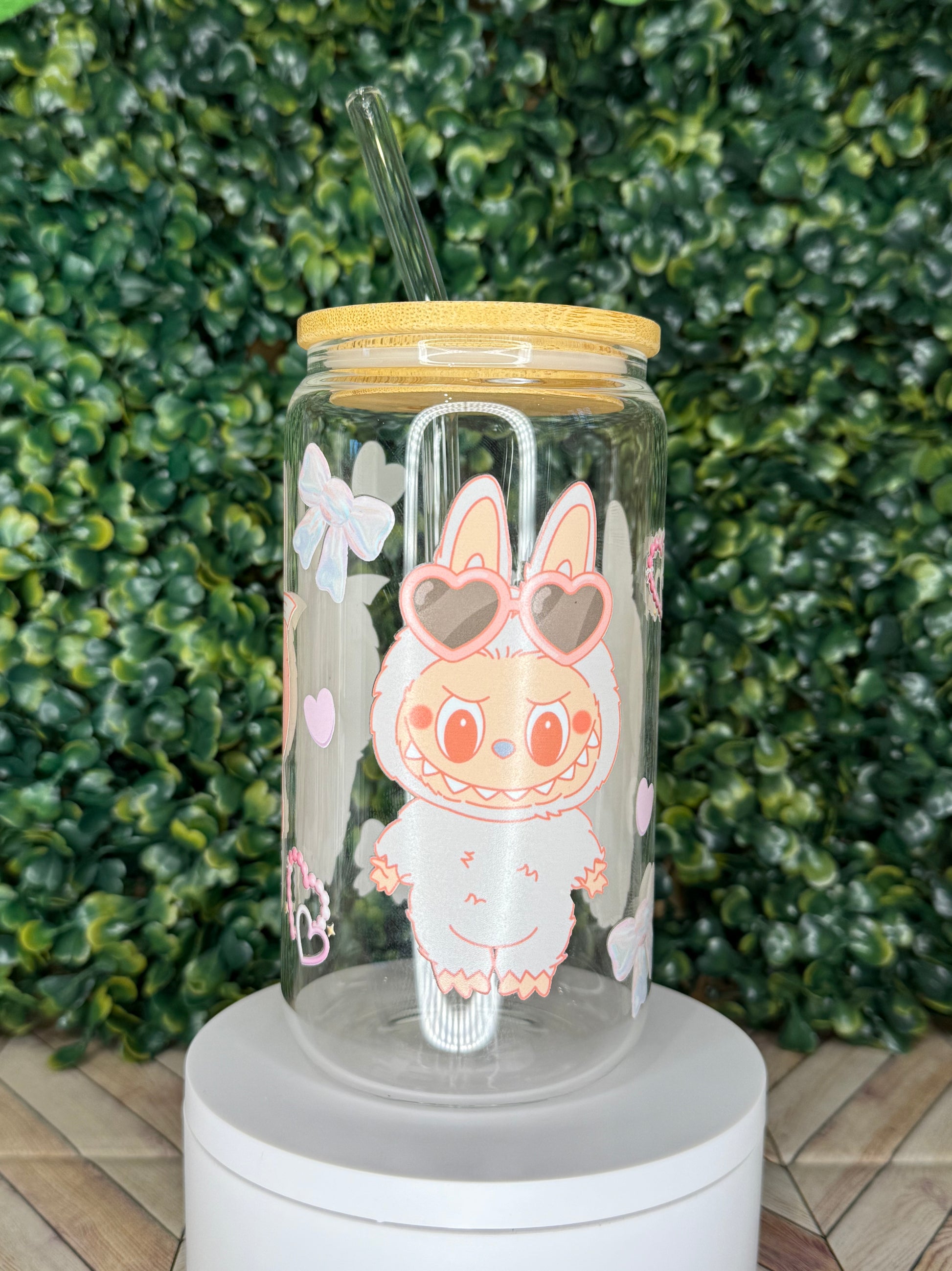 This 16oz glass can features a full wrap of Labubu characters in all their quirky glory—standing tall, striking poses, and radiating personality. It’s fun, bold, and totally collectible.