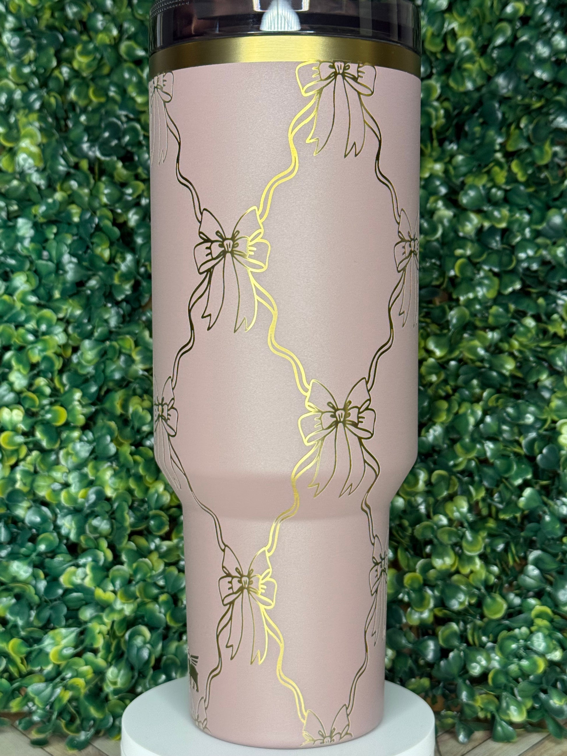 Featuring a graceful repeating bow-and-ribbon pattern, this design brings a soft, elegant feel to your everyday cup. Each line is laser-engraved directly into the surface — no vinyl, no fading — just beautifully permanent detail that catches the light with every sip.